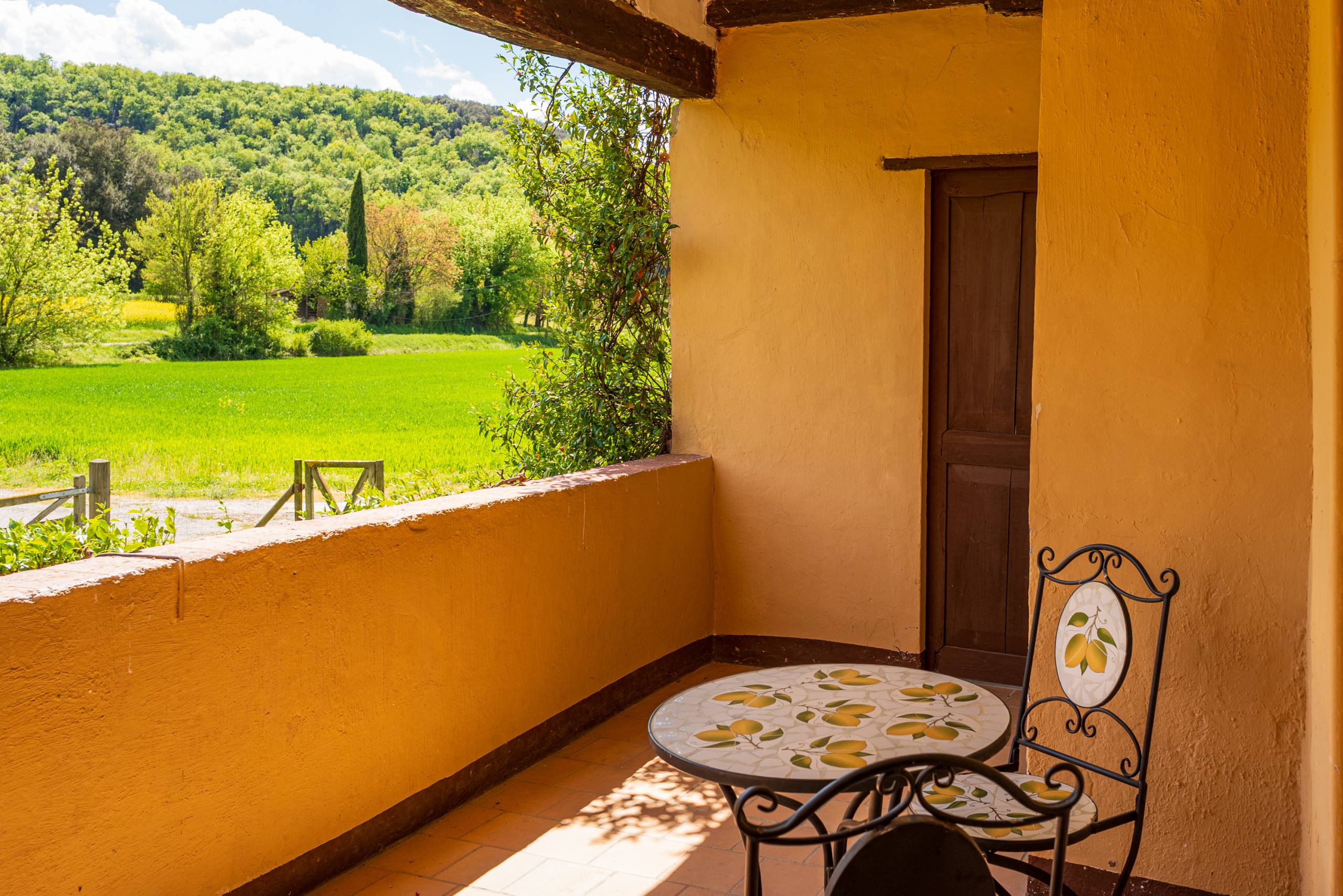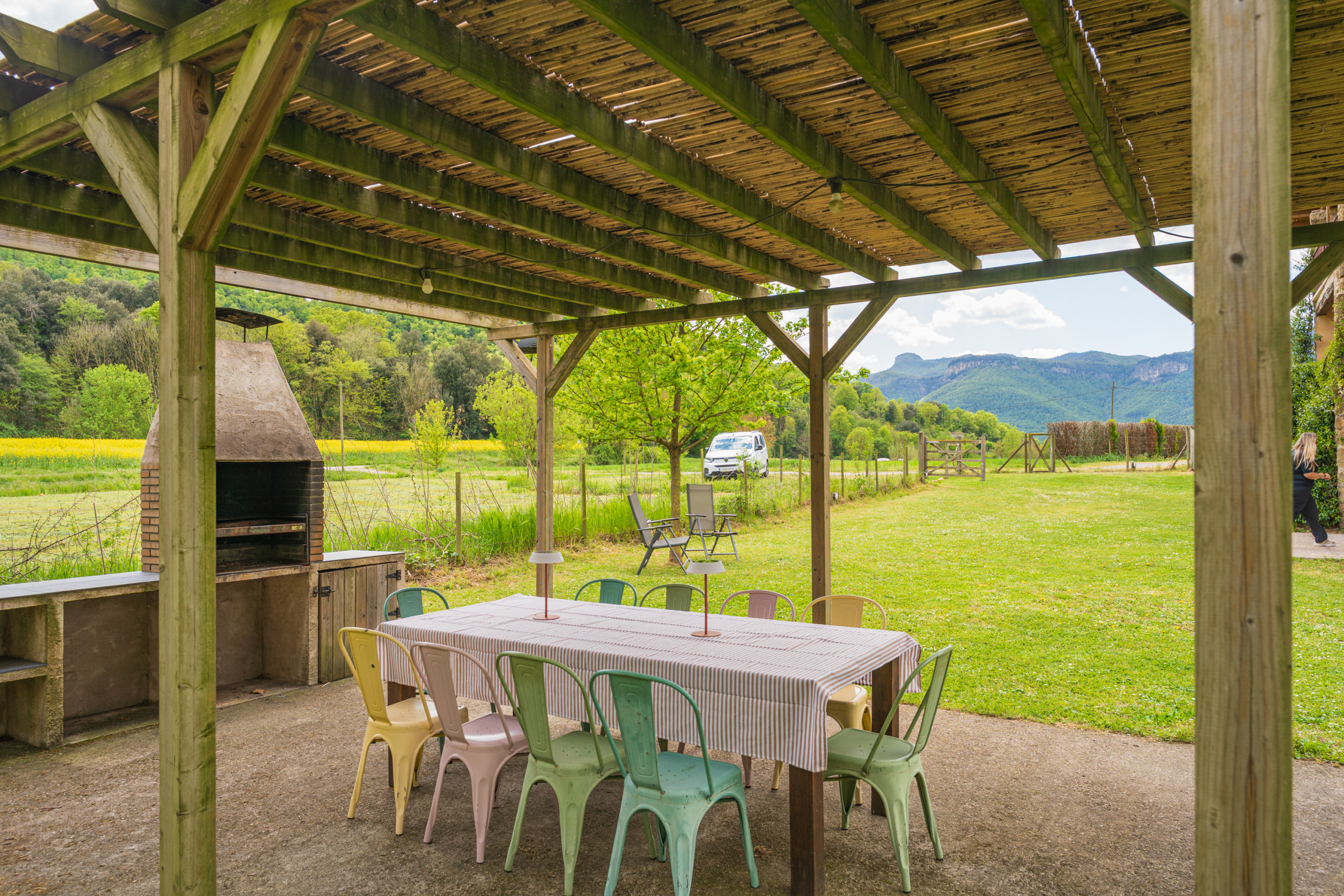 Majordoms Famada sits in open countryside on the edge of Sant Esteve d'en Bas, a quiet village in La Vall d'en Bas — a broad, green valley tucked into the southern part of La Garrotxa. The setting is genuinely rural: fields, trees, and very little passing traffic.