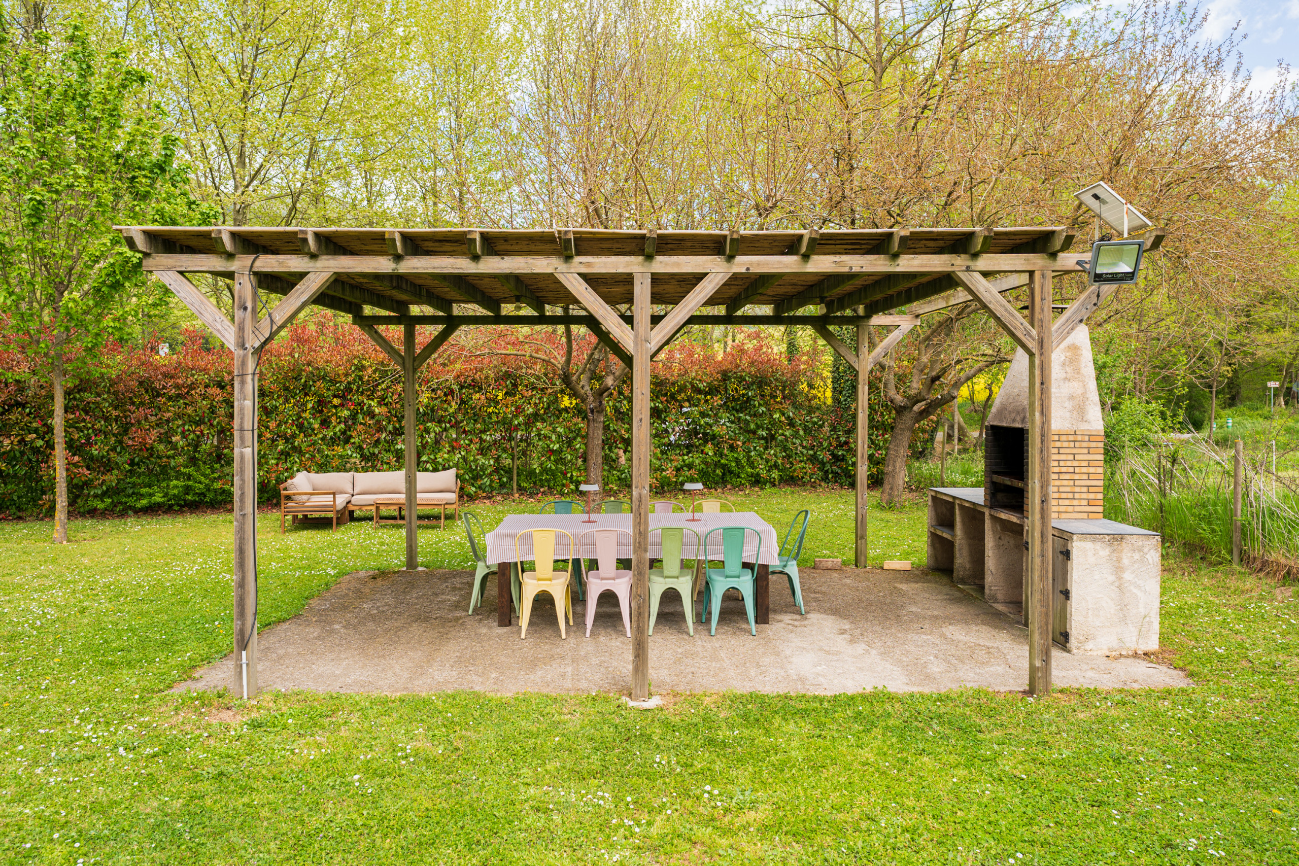 - BBQ porch – Barbecue, outdoor table and chairs for 11, shade structure, exterior lighting.