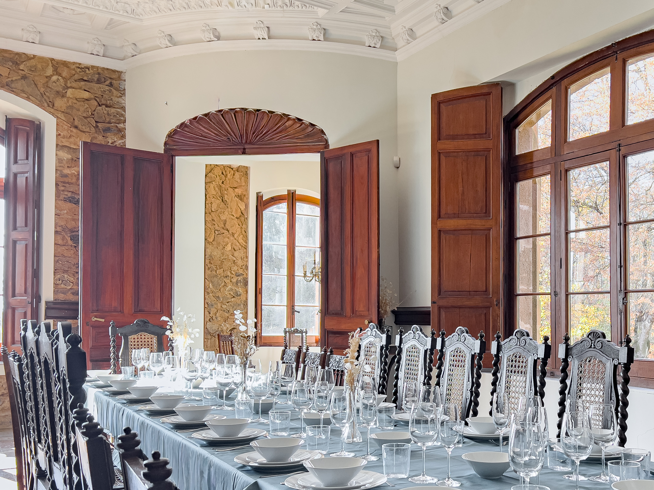 La finca completa — castillo, masoveria, jardines, piscina y todos los espacios exteriores — está exclusivamente a su disposición durante su estancia — uso exclusivo, sin otros huéspedes ni propietarios en el terreno. Nunca se reciben varios grupos simultáneamente y los propietarios no residen en la finca.